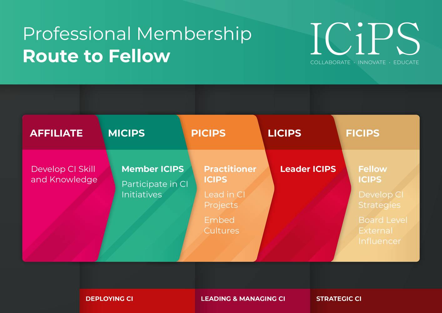 We offer four professional membership grades — Member, Practitioner, CI Leader, and Fellow - each representing a progressive stage of professional growth and recognition. Consider which grade you wish to work for - view our standards of practice.